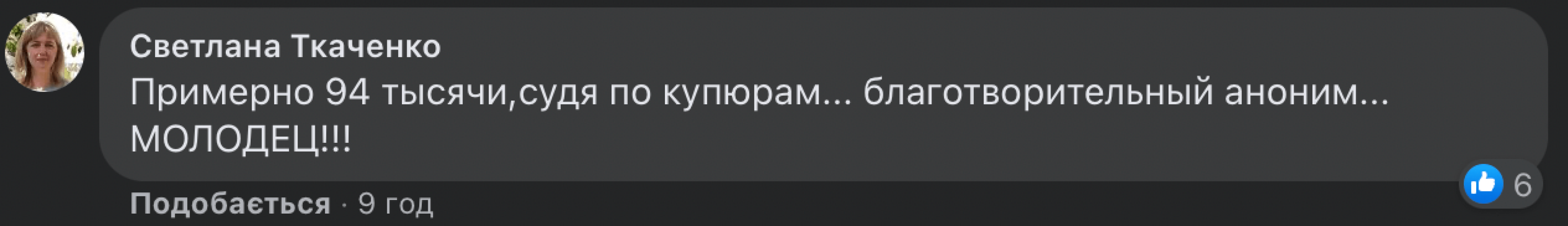 По данным издания "Пик", сумма, которой мужчина отблагодарил местную жительницу, составила 100 гривен. Сама Валентина написала в комментариях к своему посту: "Дали, и за то спасибо".