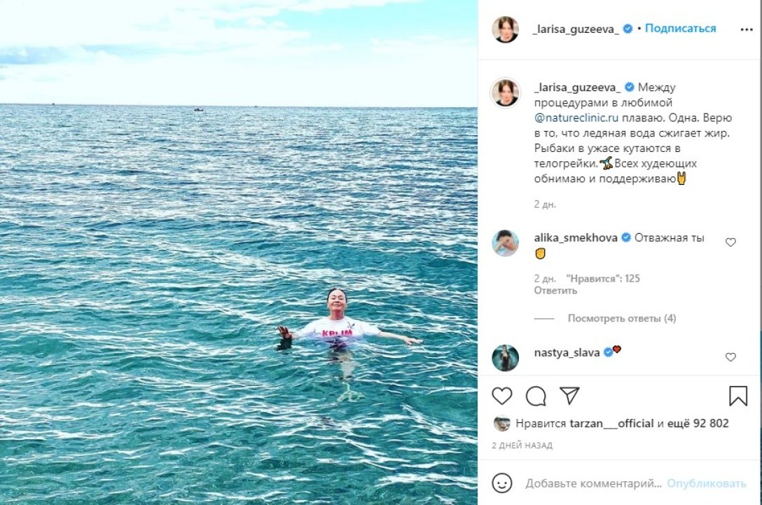 Раніше Гузєєва розмістила фотографію, на якій вона плаває в Чорному морі.