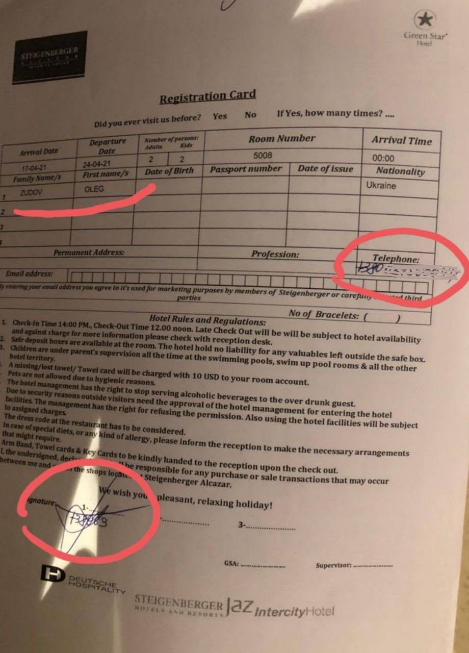 Компания решила не экономить и поселилась в отеле Steigenberger Alkazar Beach Resort, недельный отдых в котором стоит 98 тыс грн. Но какая может быть бережливость, если друг платит. Когда Александру Оросу почему-то не понравился его номер, то Зудов с удовольствием доплатил за него 210 долларов, чтобы сделать отдых товарища более комфортным и приятным. Причем, в порыве щедрости «Губа» сам заполнил карточку поселения Ороса в гостиницу и указал в ней свой личный номер телефона.