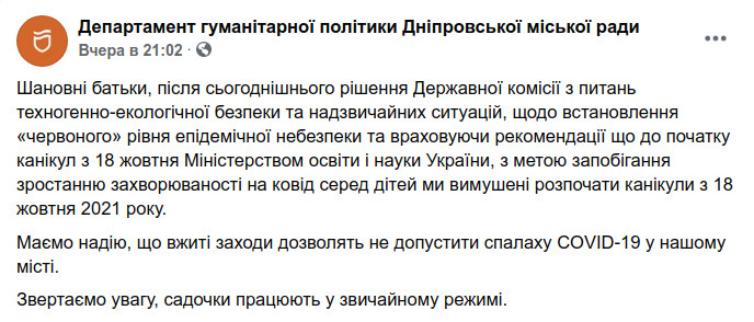 Как сообщается на официальной странице Департамента гуманитарной политики Днепровского городского совета в Facebook, из-за введения в регионе «красной» зоны карантина школы в городе уйдут на каникулы на неделю раньше, с понедельника, 18 октября.