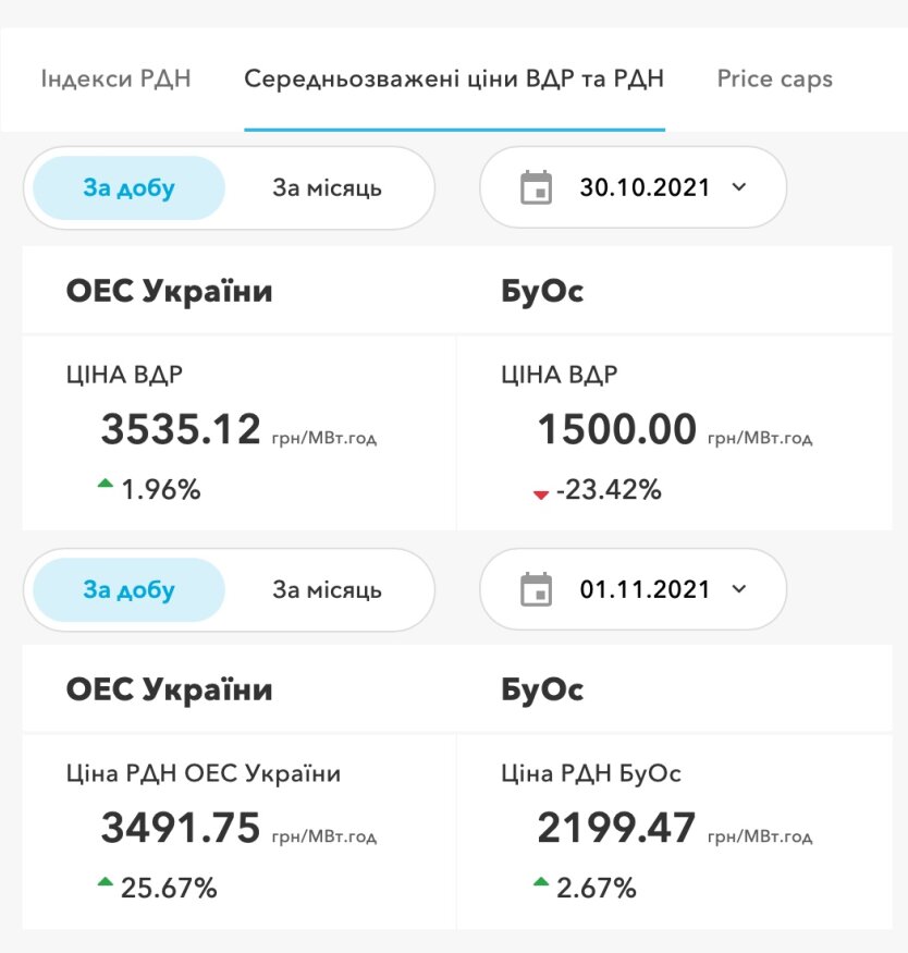 В то же время на бурштынском энергоострове цены на 1 ноября на РСВ увеличились только на 2,7% до 2199,47 гривны/МВт-ч по сравнению с 31 октября.