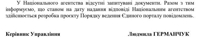 Тобто, “віз і нині там”. Але ж фінансування з державного бюджету НАЗК отримує, проте разом із тим, не виконує покладені на нього функції. Та й і це ще не кінець. У спілкуванні із НАБУ вдалося з’ясувати, що створення порталу викривачів, (звичайно, якщо роботи пов’язані з його запуском відбуваються), відбувається без нормативно-правової бази. Адже у відповіді на запит та прохання надати копію Положення (Інструкції чи іншого нормативно-правового Акту) про Єдиний державний реєстр декларацій осіб, уповноважених на виконання функцій держави або місцевого самоврядування, побачили наступне:
