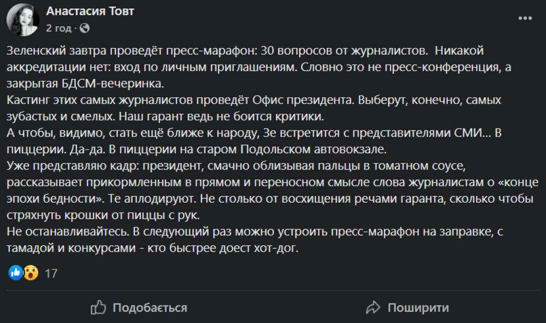 "30 вопросов от журналистов. Никакой аккредитации нет: вход по личным приглашениям. Словно это не пресс-конференция, а закрытая БДСМ-вечеринка. Кастинг этих самых журналистов проведет Офис президента. Выберут, конечно, самых зубастых и смелых. Наш гарант ведь не боится критики", — написала Товт.