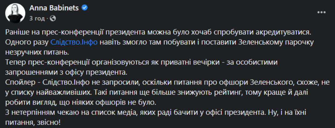 Бабинец отметила, что представители "Слідство.Інфо" не получили приглашения на пресс-конференцию, поскольку "вопросі об офшорах Зеленского, похоже, не в списке важнейших" и "еще сильнее снижают рейтинг".