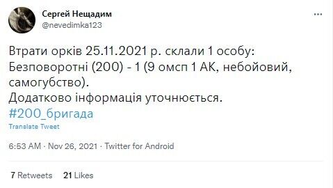 "Потери орков 25.11.2021 г. составили 1 человека: безвозвратные (200) – 1 (9 омсп 1 АК, небоевой, самоубийство). Дополнительно информация уточняется. #200_бригада", – написал он в своем Twitter.
