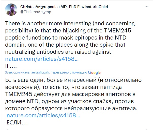 В то же время высказано предположение, что вирус захватил часть человеческого РНК, чтобы замаскировать ею свои высокоиммуногенные участки S–белка, на которые приходится основная атака антител. Закрыв спайк–белок пептидами от TMEM245, вирус фактически прикрылся "овечьей шкурой". Таким образом антитела не могут атаковать TMEM245, этот белок распознается как "свой".