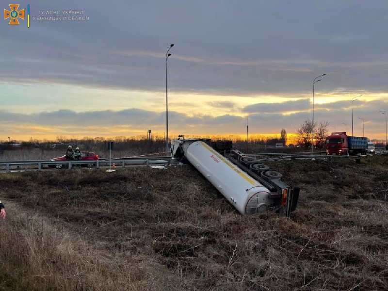 "3 декабря в 6:23 на Черкасском шоссе г. Винница на автодороге М30 Стрый-Тернополь-Кропивницкий-Знаменка-Луганск-Изварино перевернулся автомобиль, который использовался для транспортировки газа", - говорится в сообщении.