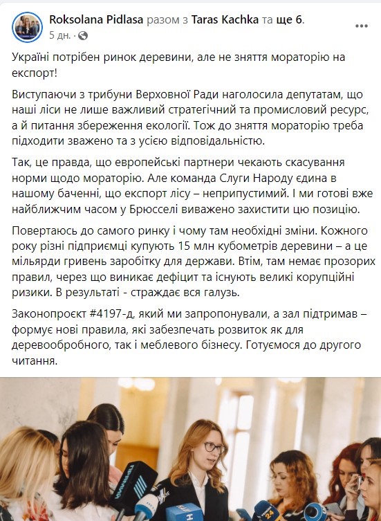 Звичайно, всі розуміли, що таке неприховане та пряме скасування Закону, в якому прописаний мораторій на експорт лісу, пов’язане з отриманням кредиту від МВФ та Євросоюзу. І тому, напевне, вирішили не злити українців та «задобрити» нас пафосними гаслами, що мораторій скасовувати не будуть.