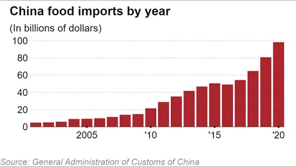 В 2020 году Китай закупил продовольствия на рекордные 98,1 млрд долларов, увеличив импорт на 22% за год и на 360% за последние 10 лет.