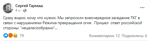 "Сразу видно, кому что нужно. Мы запросили внеочередное заседание ТКГ в связи с нарушениями режима прекращения огня. Пришел ответ российской стороны: "нецелесообразно", – сообщил Гармаш.