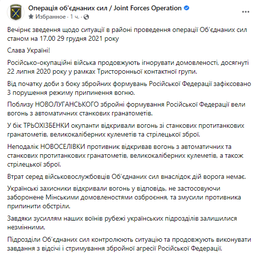 Как сообщили в штабе Операции Объединенных сил в Facebook в течение среды, 29 декабря, оккупанты трижды нарушили режим прекращения огня. ВСУ в ответ открывали огонь, однако не применяли запрещенное вооружение. В частности, вооруженные формирования РФ вели огонь: