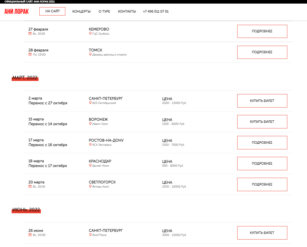 При этом среди популярных сервисов билеты на предстоящие концерты певицы есть в наличии только на сайте Кarabas.com. Их цена стартует от 400 грн до почти 3 тыс. грн. Однако, даже на Кarabas.com представлены не все города, о которых упоминала Ани Лорак. Например, сервис еще не предоставил возможность купить билет на концерт в Харькове.