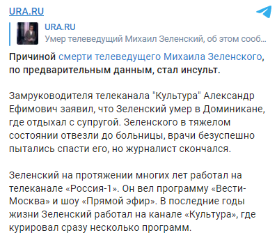 Причину смерти Зеленского обнародовал Ura.Ru в Telegram.