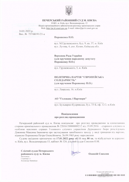 На сайте ДБР также опубликовали копию вызова Порошенко на заседание суда по избранию ему меры пресечения: