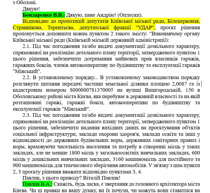 "дається пряме доручення виконавчому органу, ось ми доповнили пунктом 2, виконавчому органу при видачі документів дозвільного характеру, а Свистунов буде видавати містобудівні умови і обмеження, щоб чітко було зафіксовано, що місць там буде понад ту норму, яка встановлена в графічній і текстовій частинах ДПТ, але визначено рішенням Київської міської ради. І це позиція фракції "УДАР"