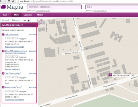 | Клікніть для збільшення. Фірми, що перебувають по вулиці Механізаторів, 10 |