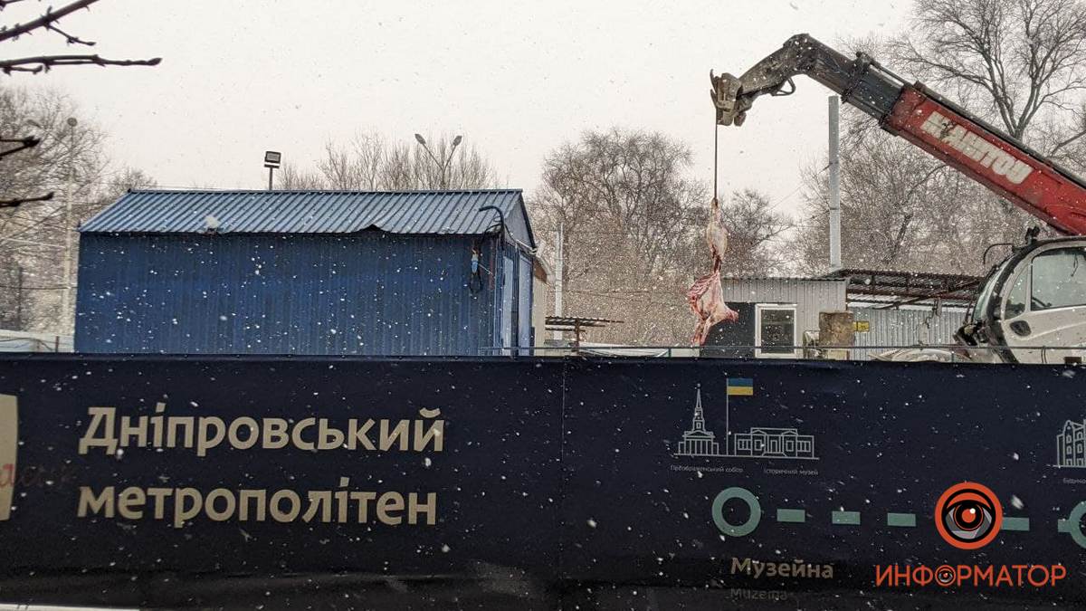 На стройплощадке метрополитена в Днепре на стреле крана повесили тушу животного