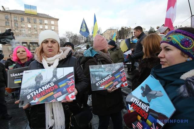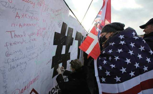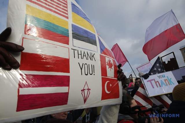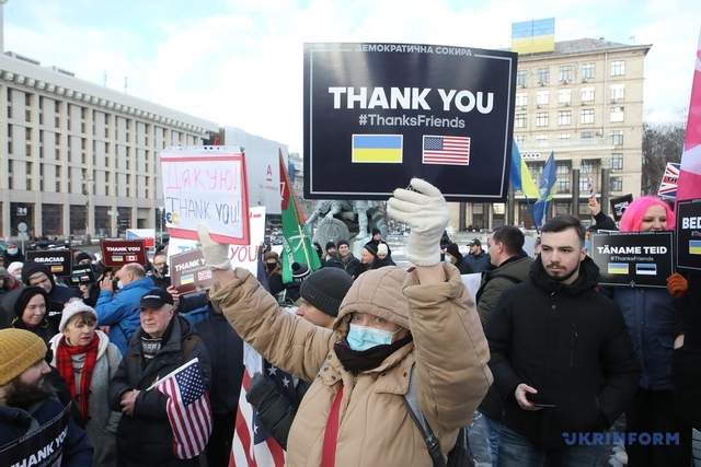 Десятки украинцев на Майдане Независимости развернули плакат с надписью #ThanksFriends. Они также вывесили много флагов стран, которые помогают Украине с вооружением: Великобритании, США, Польши, Эстонии, Литвы, Латвии, Канады, Чехии и Турции.