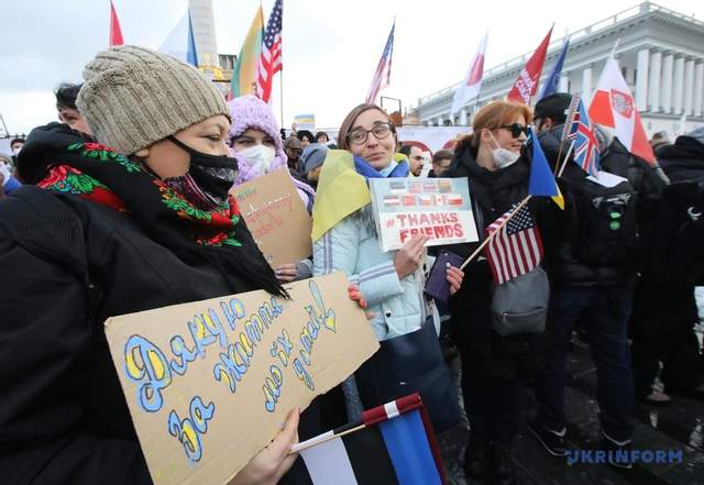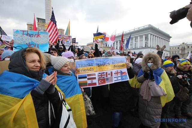 Один из организаторов мероприятия, лидер политпартии "Демократична сокира" Юрий Гудыменко рассказал, что украинцы собрались 30 января на Майдане, чтобы поблагодарить союзников за помощь.