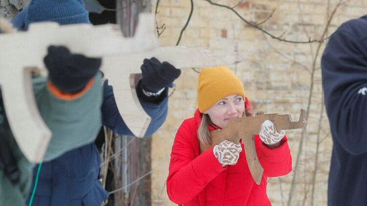 На фото Euronews видно, как украинские женщины во время тренировок девушки отрабатывали приемы с деревянными автоматами.