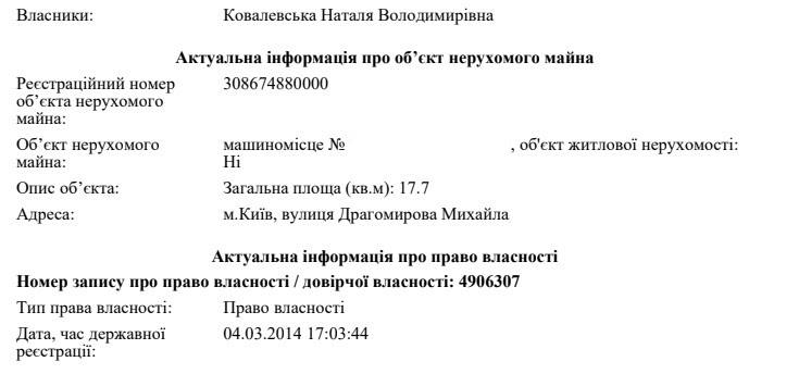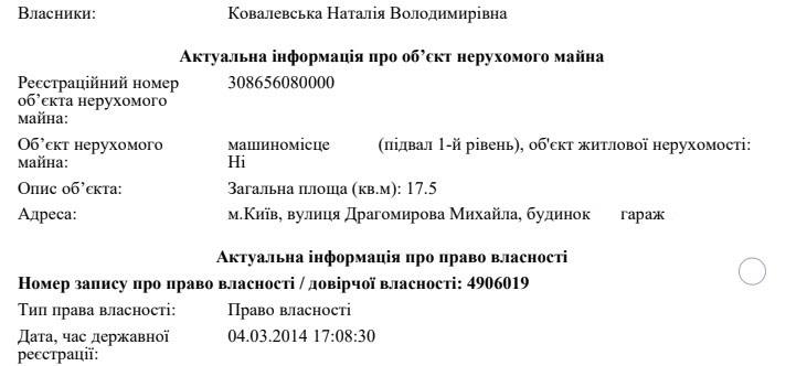 На сьогодні вартість квартири з приблизно такою ж квадратурою складає більше 1 млн $. А два паркомісця, ймовірно, для автомобілів, які належать Наталії Володимирівній.
