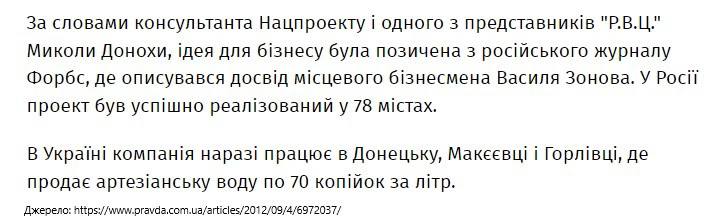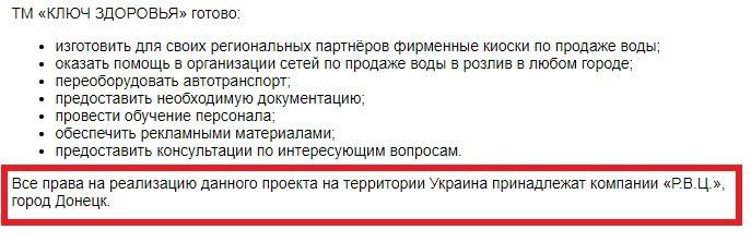 Так ось, у 2013 році компанія ПП “Р.В.Ц.” виступала головним натхненником створення проєкту “Чиста вода” з продажу населенню фільтрованої питної води. І вже, навіть, почало її реалізовувати під торговою маркою “Ключ здоровья”. Швидше за все, Доноха та Ковалевський викупили франшизу російської торговельної марки “Ключ здоровья” і продавали воду під цим брендом до початку війни в Україні.