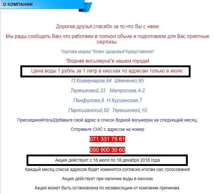 А, можливо, і досі реалізують її на непідконтрольних територіях? Так як у 2018 році діяла акція небувалої щедрості. Сайт “Ключ здоровья” і досі працює, де зазначено, що з 18 липня до грудня 2018 ціна за літр води складатиме аж один російський рубль.
