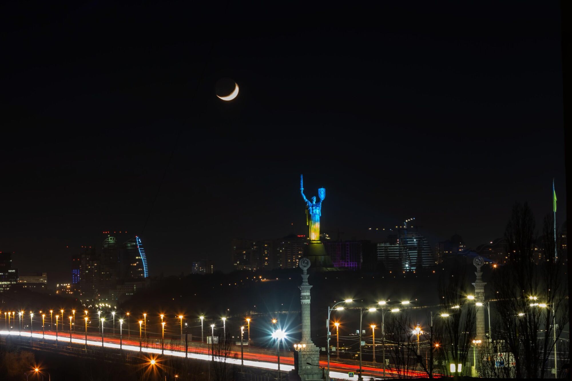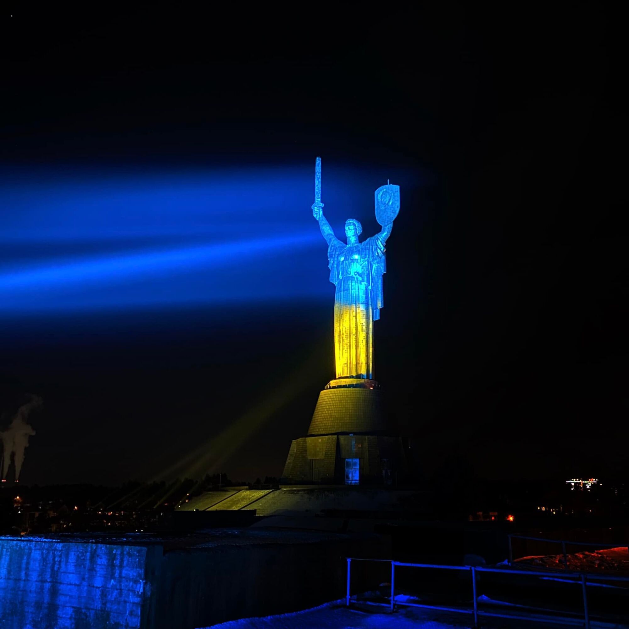 В Києві підсвітили монумент «Батьківщина-мати» жовто-блакитними кольорами українського прапору. Він буде підсвічений до кінця дня 4 лютого.