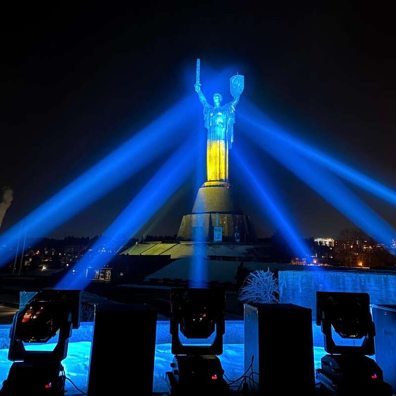 Монумент "Родина-мать" в Киеве подсветили в цвета государственного флага. Целью такой акции стало объединение украинцев для защиты своей страны.