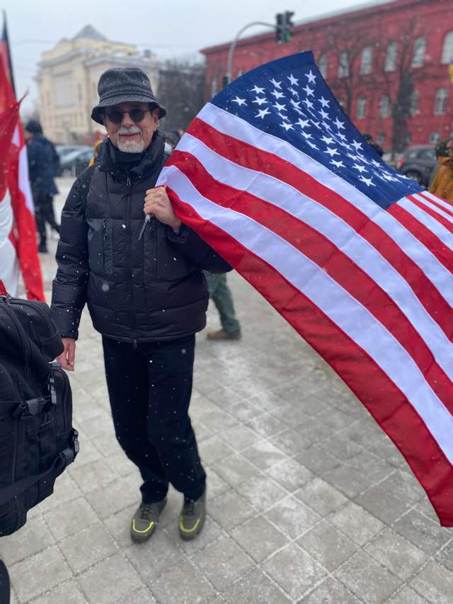 Среди флагов можно было заметить флаги США, Италии, Великобритании, Грузии. Также развевался украинский флаг и ЕС.