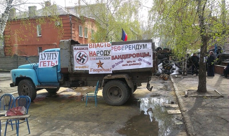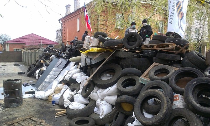 Славянск не контролируется украинскими властями. Город полностью находится во власти захвативших его группировок сепаратистов, и представляет собой эдакое Гуляйполе, со всех сторон обнесенное баррикадами из покрышек. Баррикады устроены на въездах в город в несколько рядов. На них стоят уже привычные всем молодые ребята в масках и касках – кто с автоматом, кто с палкой. На некоторых стражниках надеты светоотражающие жилеты сотрудников ГАИ. Они с видимым удовольствием останавливают машины, просят открыть багажник, проводят осмотр. Власть до небес превозносит чувство собственной важности обычного пэтэушника, который еще вчера стыдливо платил 20 гривен за зачет.