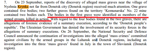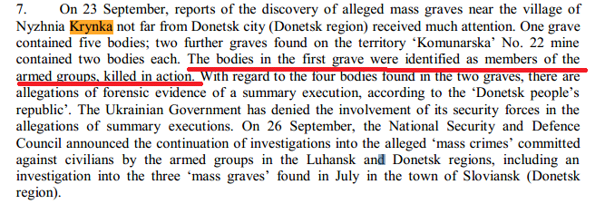 У підсумку, у звітах місії ООН і Amnesty International йдеться про те, що було виявлено три поховання з 9 тілами, 5 з яких були представниками так званої "ДНР", що загинули в боєзіткненнях зі ЗСУ.