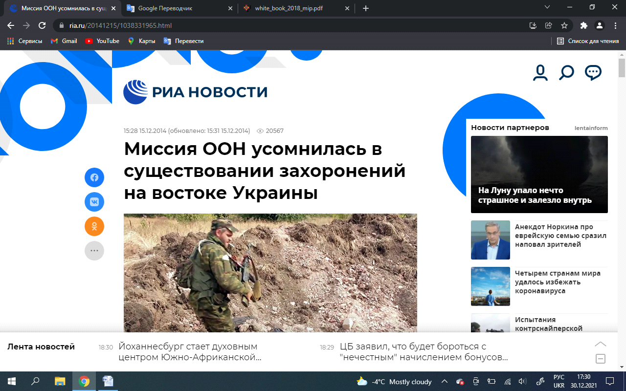 15 грудня моніторингова місія Управління верховного комісара ООН з прав людини, яка спостерігає за ситуацією в Україні, оприлюднила інформацію, що у неї немає даних про місця розташування масових поховань, що ставить під питання їхнє реальне існування.