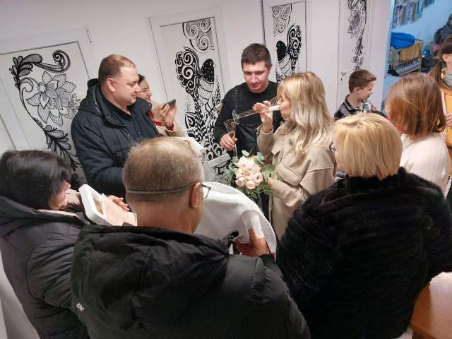 В Авангарде получили сигнал "Тревога". Поэтому все присутствующие перешли в бомбоубежище. Там в 10:15 администратор Елена Шрамко зарегистрировала брак Владислава и Натальи Клевцив.