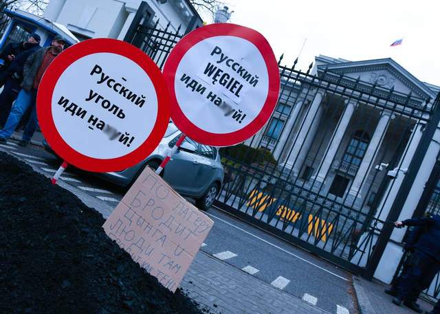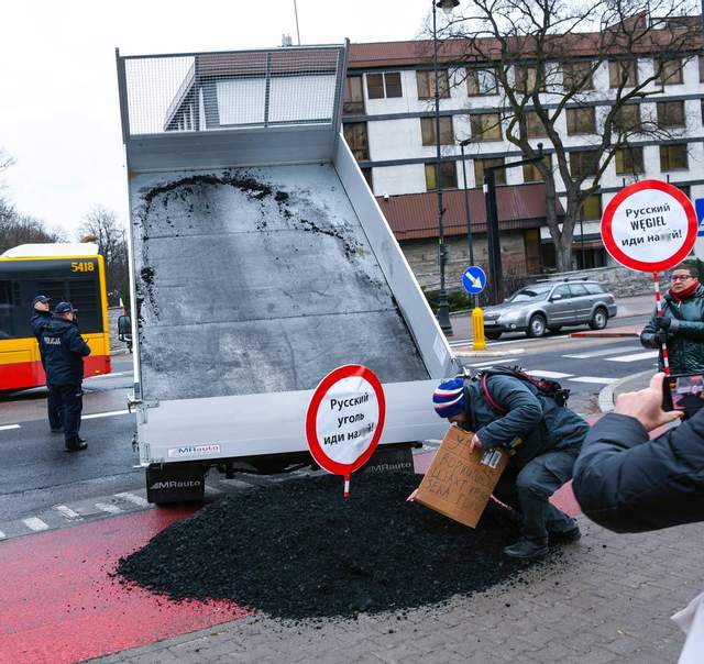 Участники акции приехали грузовиком к главным воротам посольства России в Варшаве и выгрузили уголь. Другие активисты воткнули в насыпь плакаты на польском и русском языках с надписями типа "Русский уголь, иди на**й".