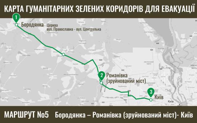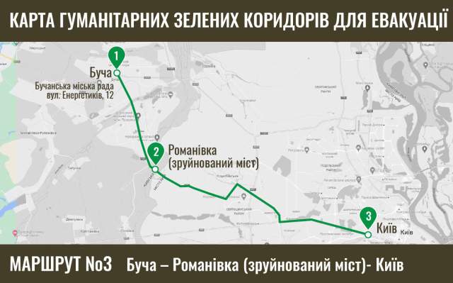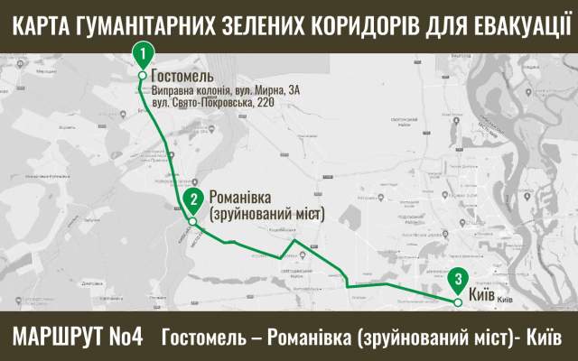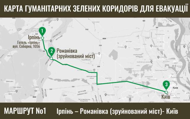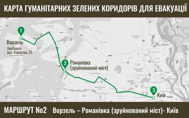 Отметим, что эвакуация будет происходить из Ворзеля, Бородянки, Ирпеня и Гостомеля через Стоянку, а также Белогородку до Киева.