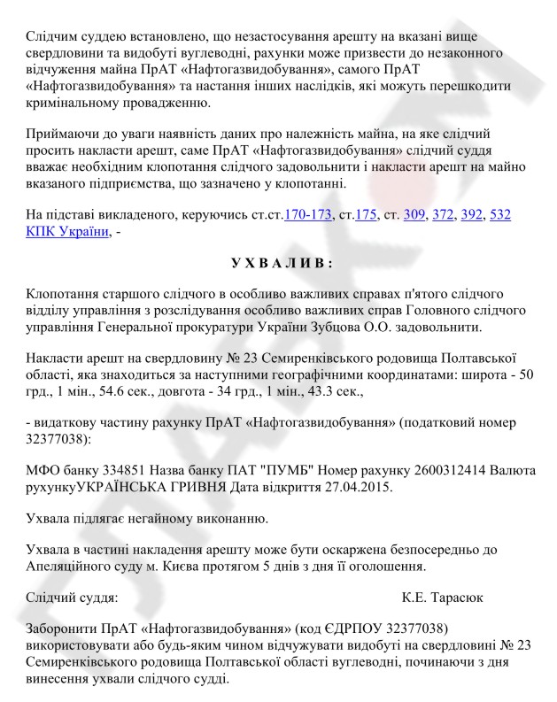 29 мая 2015 года был наложен арест на скважины №1, 2, 3, 4, 5, 51, 52 Мачухского месторождения и скважины №1, 2, 3, 4, 6, 7, 8, 9, 10, 16, 17, 51, 60, 62, 63, 64, 70 Семиренковского месторождений.