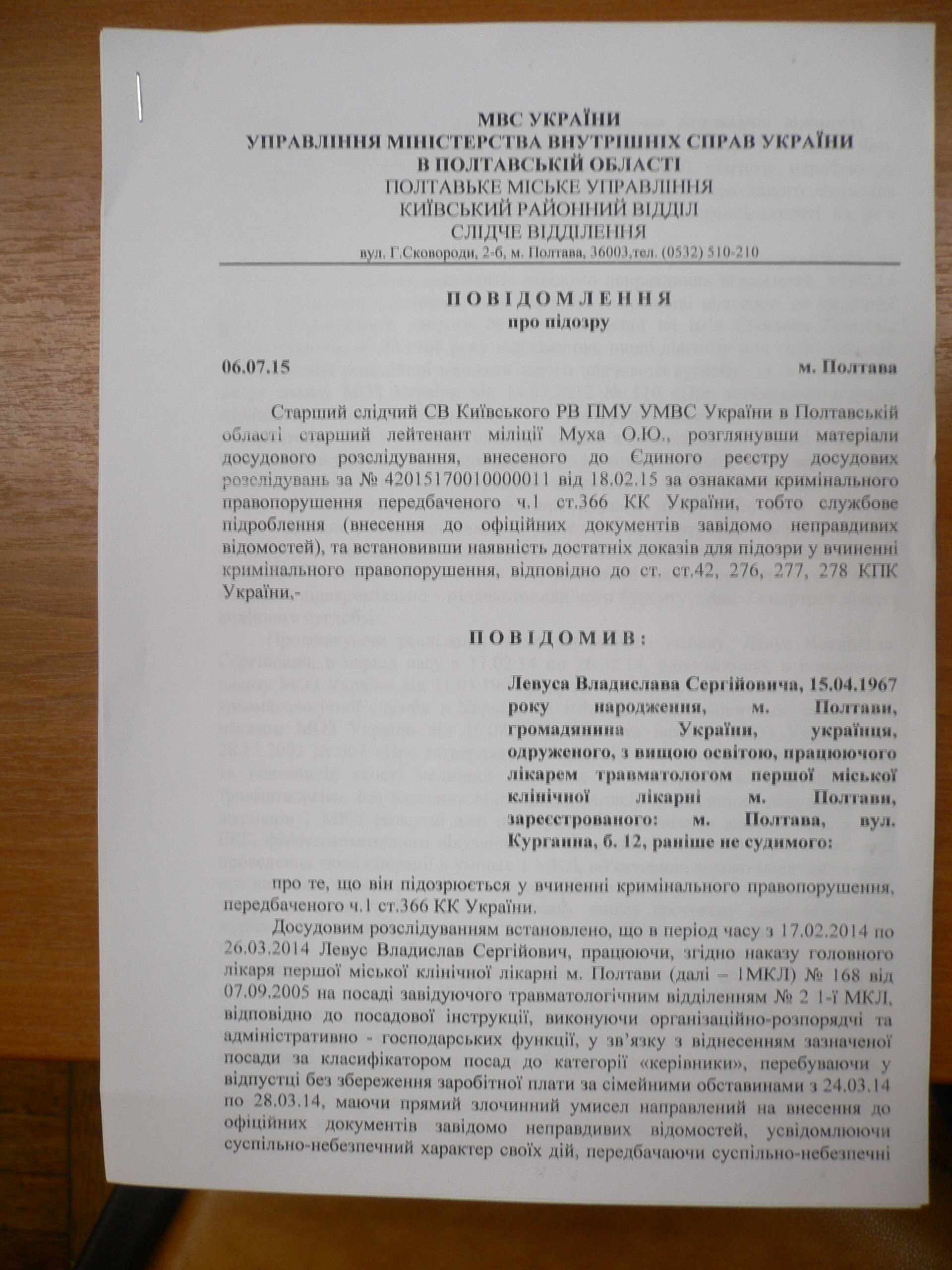 Як сказано в підозрі, що Левус В.С., працювавши на посаді головного лікаря першої міської клінічної лікарні м. Полтави (надалі 1МКЛ - ОБ), заніс завідомо неправдиві дані в історію хвороби громадянина Сікалова Г.А. стосовно зробленої йому операції на лівому плечі.