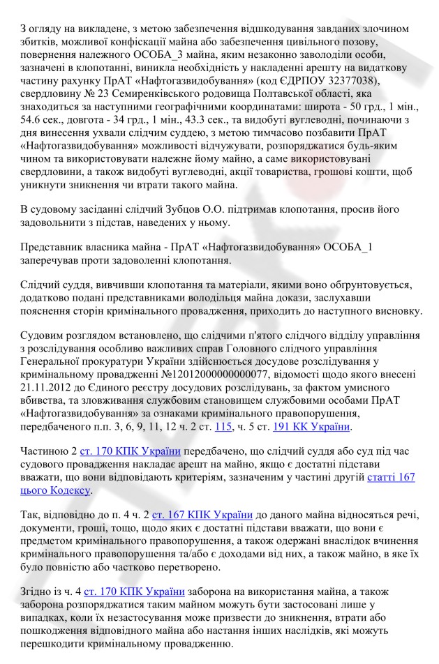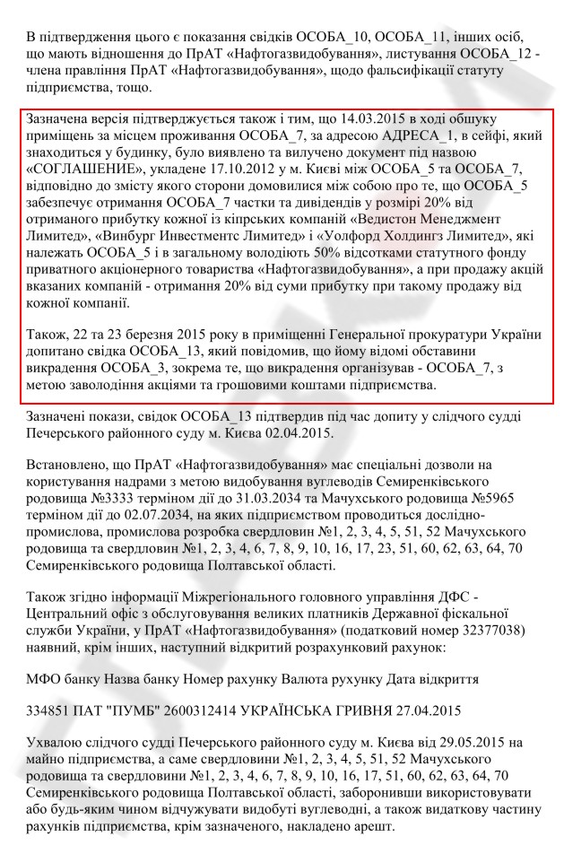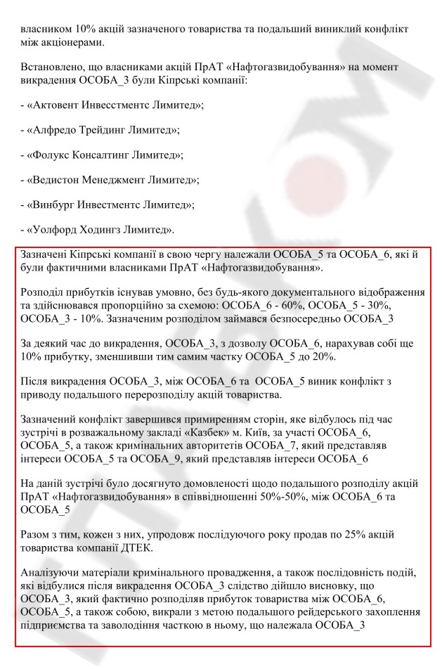 Следователи установили, что собственниками акций газодобывающей компании на момент похищения топ-менеджера были кипрские структуры: «Актовент Инвесстментс Лимитед», «Алфредо Трейдинг Лимитед», «Фолукс Консалтинг Лимитед» (по данным «Главкома» контролировал Николай Рудьковский), а также «Ведистон Менеджмент Лимитед», «Винбург Инвестментс Лимитед», «Уолфорд Ходингз Лимитед» (по данным «Главкома» контролировал Нестор Шуфрич)