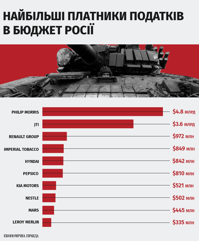 Журналисты ЭП вместе с командой депутата Марьяна Заблоцкого провели исследование и посчитали, сколько налогов уплачивают в бюджет РФ компании, продолжающие бизнес в террористическом государстве. Расчеты произведены на базе открытых источников – по публичной отчетности российских юрлиц международных компаний за 2021 год.