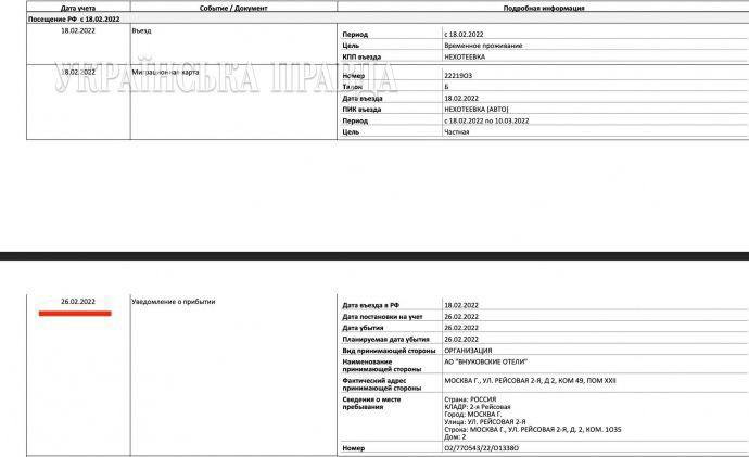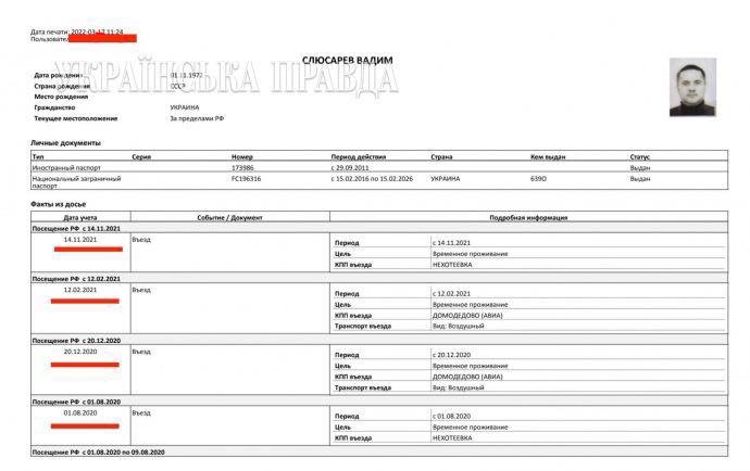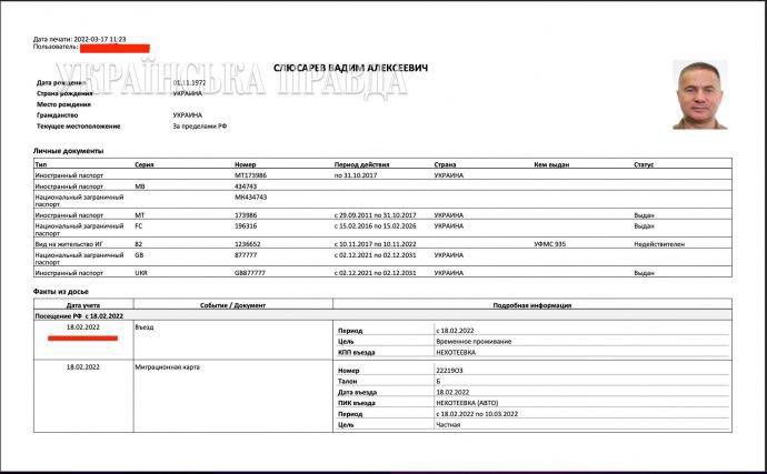 По данным базы 18 февраля, Слюсарев въехал в Россию на авто через КПП "Нехотевка". Целью указано "временное проживание". А 26 февраля на третий день после вторжения России Слюсарев стал на учет, отметив запланированную дату выезда 26.02.2022. Хотя в момент пересечения границы в базе отмечается период пребывания до 10 марта.