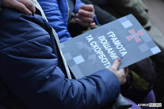 По традиционному военному ритуалу гробы погибших Героев покрыли сине-желтым флагом. После завершения церемонии семьям павших воинов командующий ВМС со словами сострадания и поддержки передал грамоты уважения и скорби.