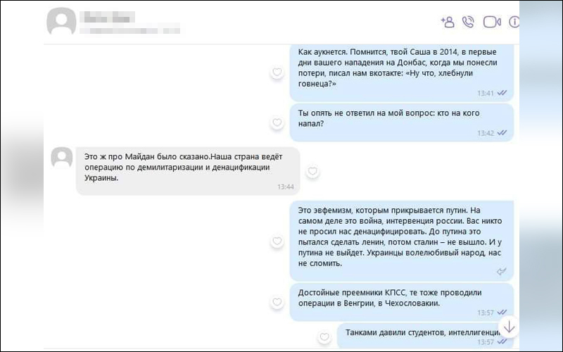 Троюрідна сестра їй відповідала, «що це не війна, це спецоперація, чого ви мовчите про те, що робиться на Донбасі і в Криму вже 8 років».