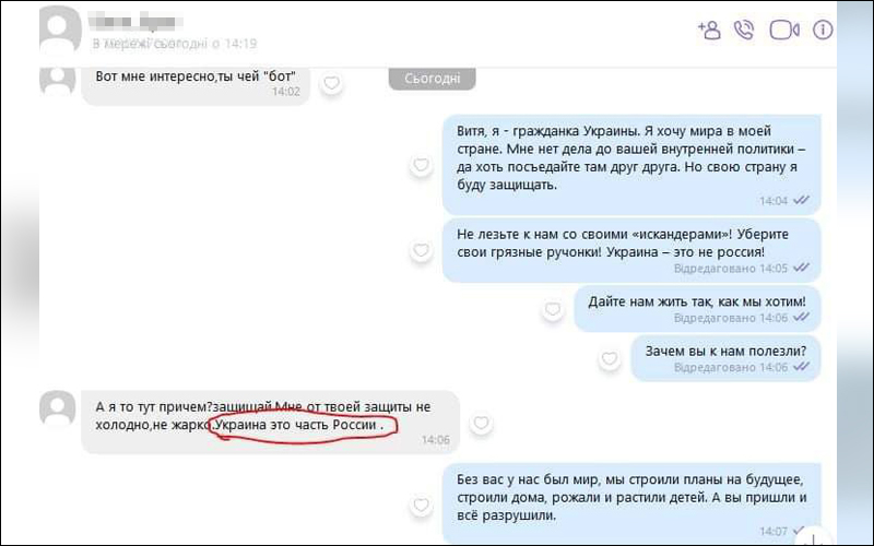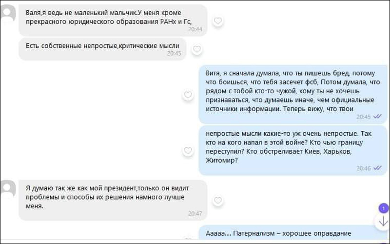 – Спочатку думала, що ти пишеш маячню, бо боїшся, що тебе засіче фсб, потім думала, що поряд з тобою хтось чужий, кому не хочеш зізнаватись, що думаєш інакше ніж офіційні джерела інформації. Тепер бачу, що твої непрості думки якісь дуже непрості. Хто на кого напав в цій війні? Хто чий кордон перейшов? Хто обстрілює Харків, Київ, Житомир?