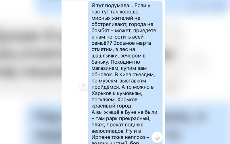 Родичка казала, що люди в Україні обдурені, втратили розум і що особисто вона не вірить, що росіяни намагались підірвати Запорізьку атомну електростанцію. Буцімто це були українські диверсанти. Була впевнена, що Зеленський втік у Польщу та чекає там допомоги від НАТО.
