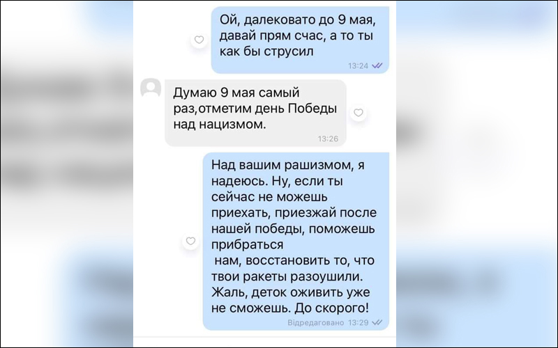 – Над вашим рашизмом, я сподіваюсь. Якщо зараз не можеш, приїжджай після нашої перемоги, допоможеш прибратися, відновити те, що твої ракети зруйнували. Жаль, що діток оживити вже не зможеш.