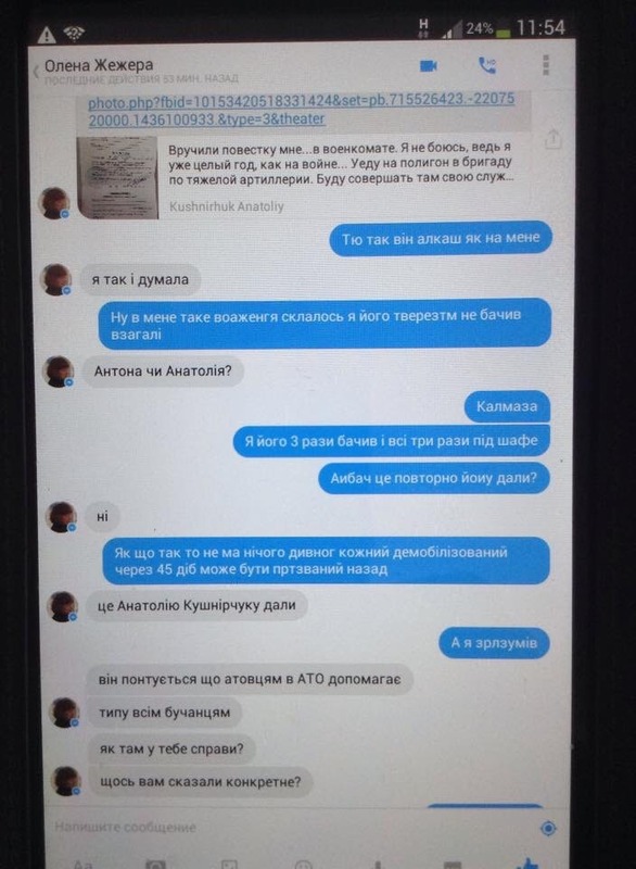 Крім того, у переписці журналістка відправляє Сацику посилання на допис Анатолія Кушнірчука у «Фейсбуці», де волонтер коментує вручення йому повістки такими словами:
