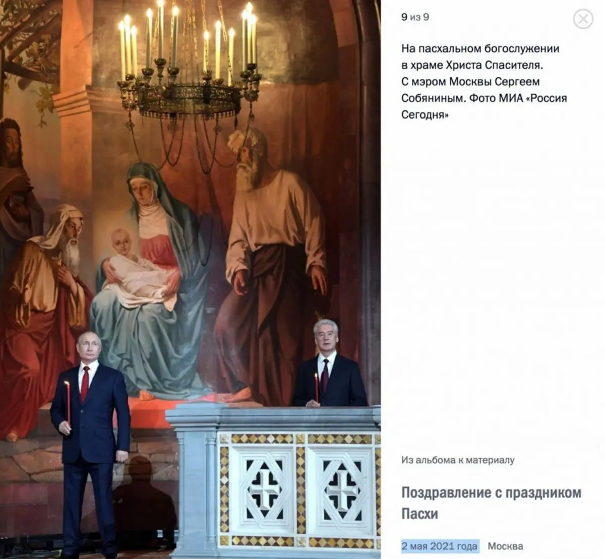 Более того, распространяемое фото с Путиным с пасхальной службы было сделано в 2021 году. Об этом свидетельствует то, что Путин и Собянин одеты так же, как в 2021 году, у них такие же прически, они держат красные свечи.