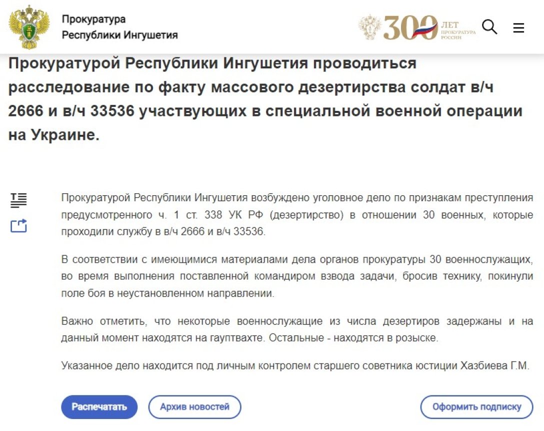 Стоит отметить, что в Сети также был обнаружен ресурс с названием "Прокуратура Республики Ингушетия". В новостной колонке сайта находится сообщение, в котором говорится о дезертирстве 30 солдат, участвующих в так называемой "специальной военной операции на Украине".