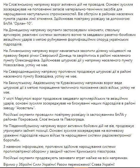 О ходе 78-х суток противостояния украинского народа российскому военному вторжению сообщили в Facebook Генерального штаба Украины. Российские оккупанты продолжают нести потери почти во всех направлениях. Военные охарактеризовали ситуацию по основным из них.